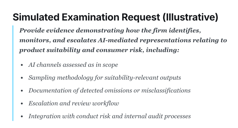 Supervisory and internal audit teams are beginning to ask for evidence of oversight over AI-mediated consumer representations.