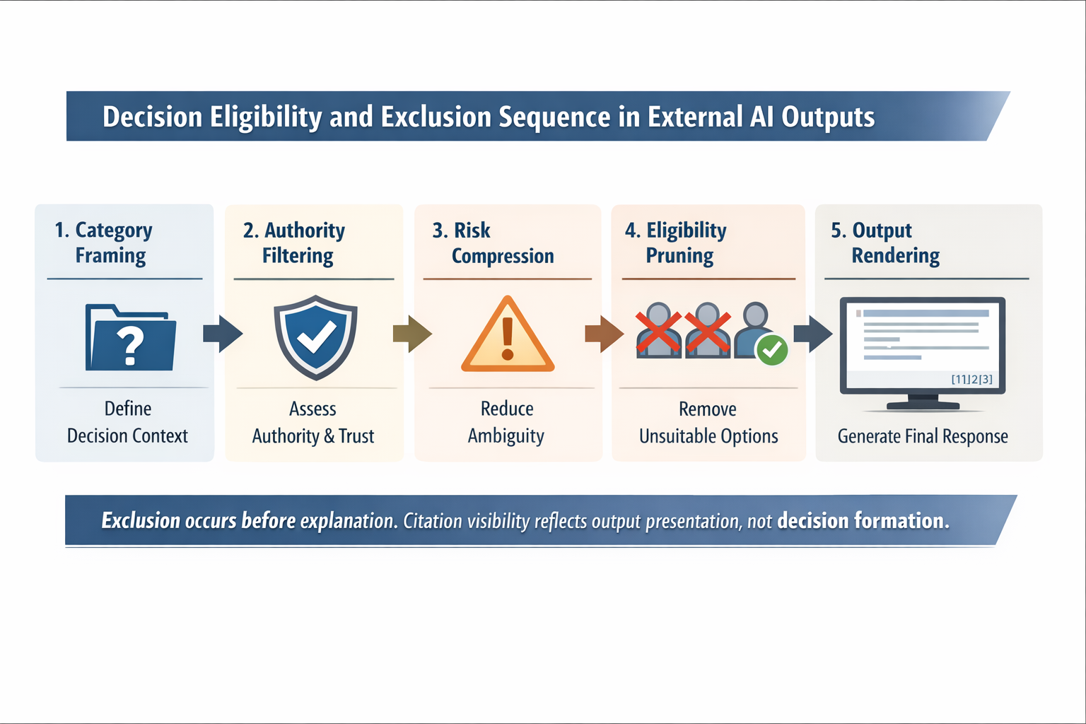 Decision exclusion most frequently appears after the model has established framing and narrowed the candidate set. At that point, citations often decline or vanish while authority weighting intensifies.